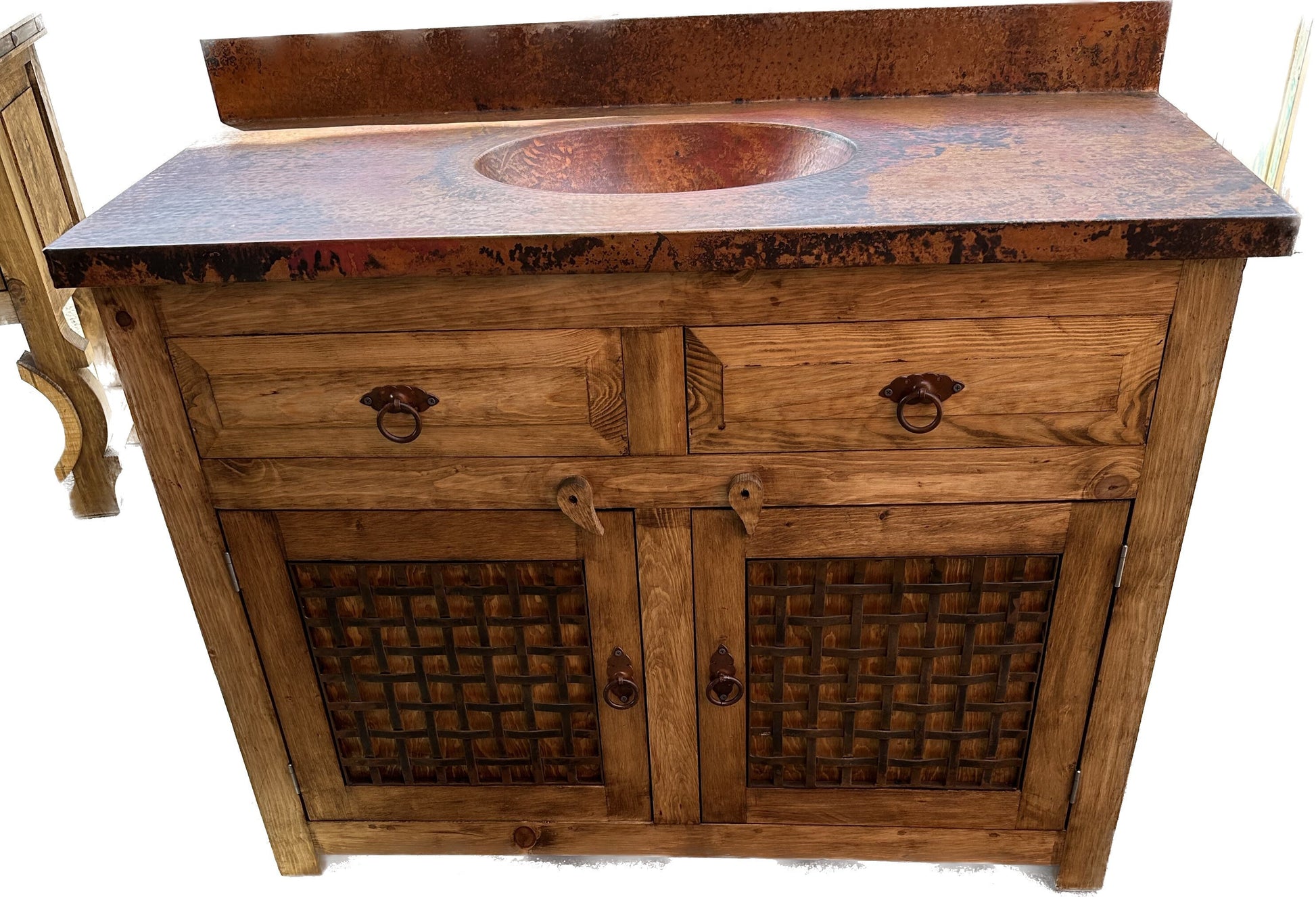 Beautiful copper top vanity with 2 false drawers and 2 metal accent doors. The vanity has plenty of storage underneath and medium color wax finish.