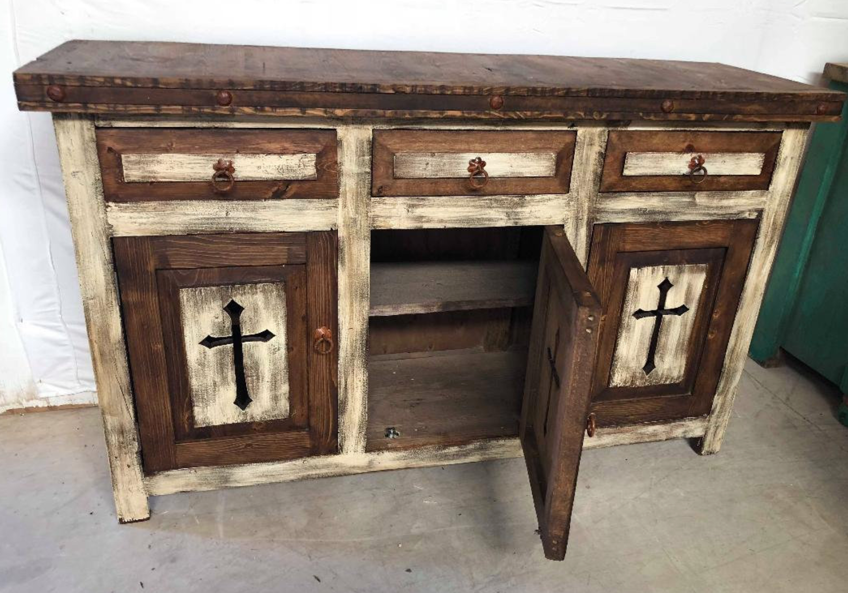 Beautiful barn wood vanity hand crafted from 100% barn wood from Mexico. The old barn wood has a lot of unique characteristics which makes it very unique. The vanity has Crosses on doors which gives it a lot of style. The top has been sealed to protect the wood from water damage.