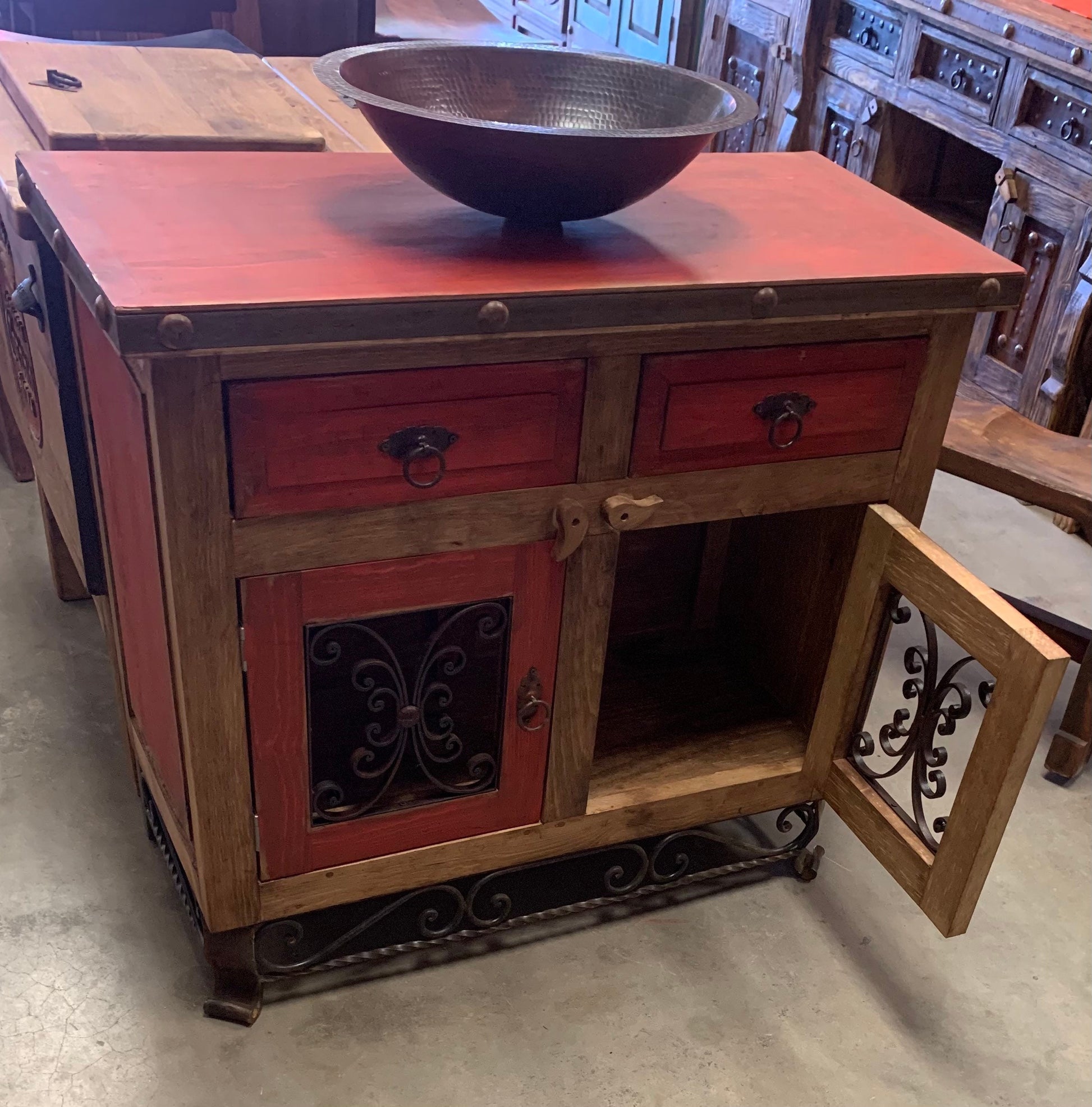 Beautiful red bathroom vanity with metal accents. This piece is handmade and has a wax finish. Very unique piece with the metal doors and metal base. Sink not included.