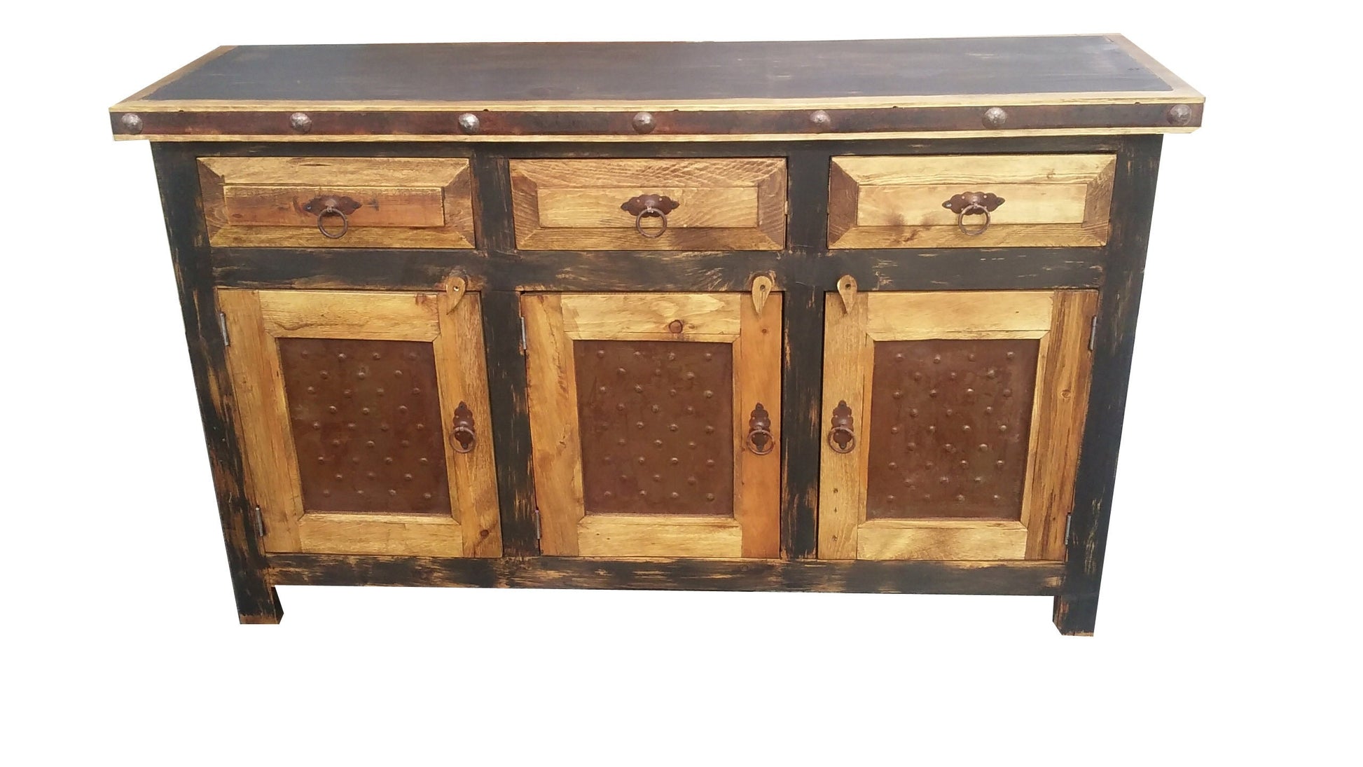 A beautiful barn wood vanity hand crafted from 100% barn wood from Mexico. The old barn wood gives our vanities a lot of unique characteristics which makes it very special. The wood is hand rubbed with paste wax. It’s a distressed black wash with a medium wax stain.. The top has been sealed to protect the wood from water damage. The doors have oxidized metal. Left and right drawers false to allow plumbing..