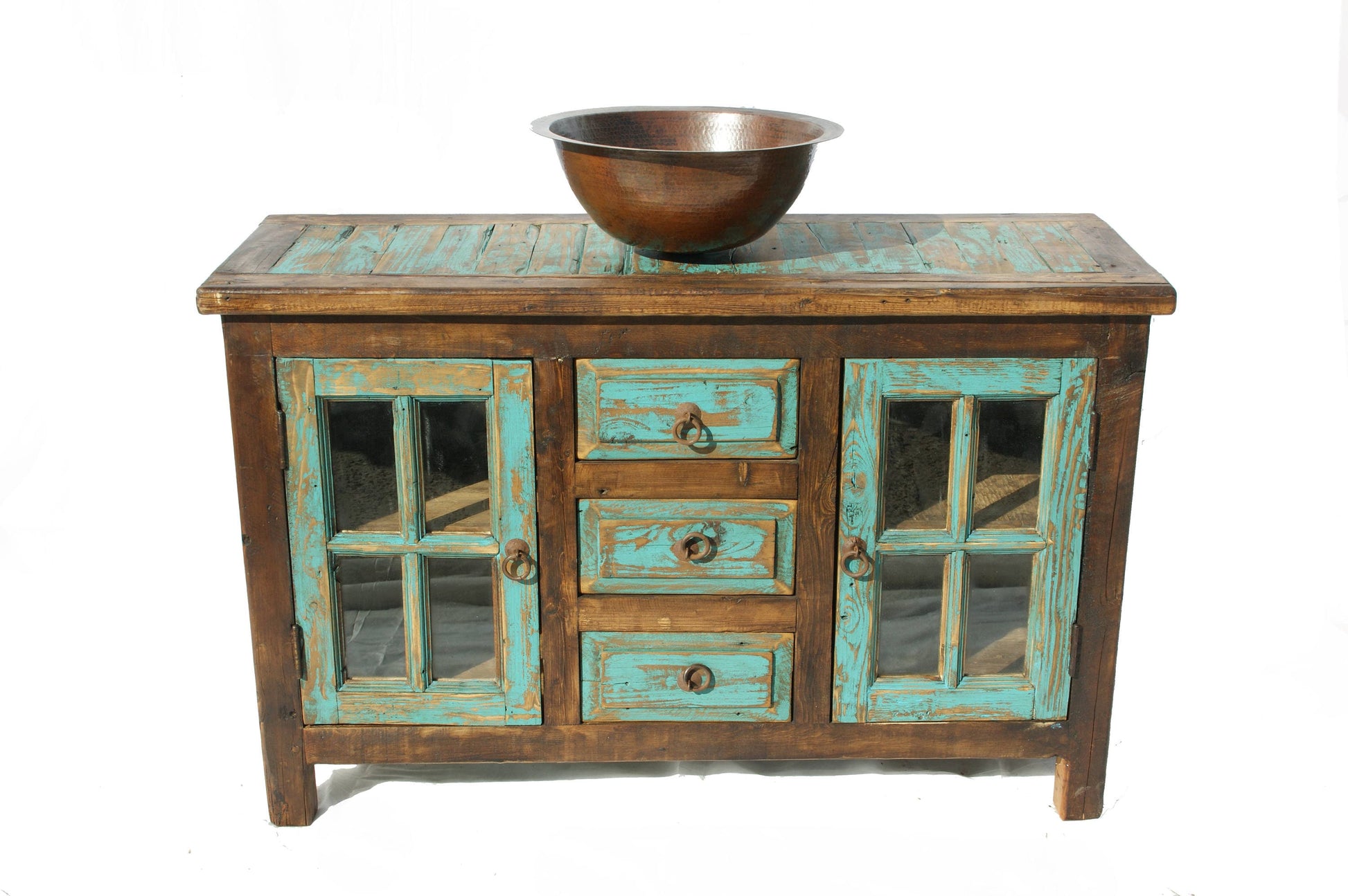 Rustic Glass Door Bathroom Vanity, Turquoise, False Top Drawer