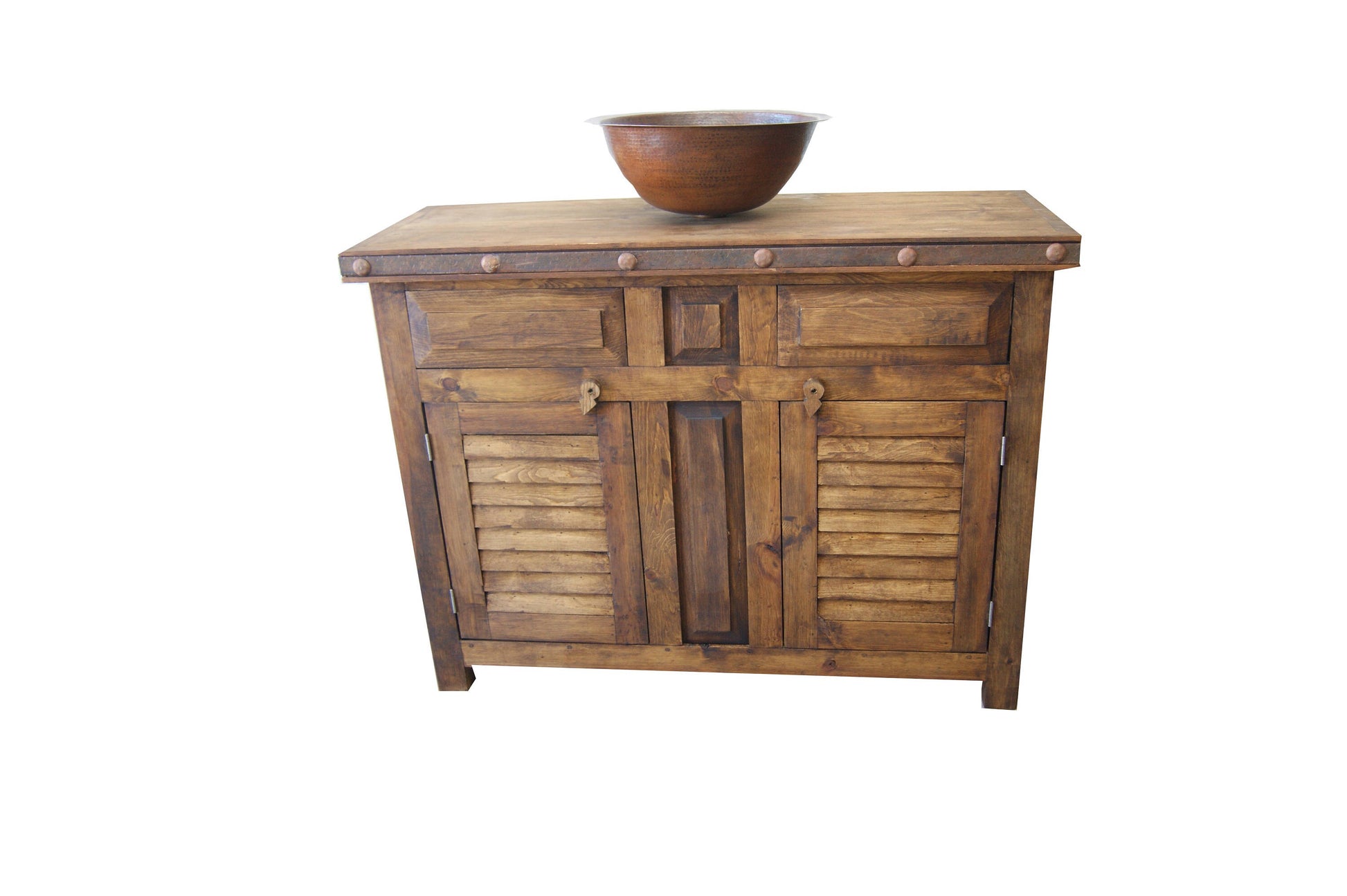 This beautiful barnwood vanity has shutter style doors. The vanity is made from reclaimed wood. Please expect imperfections in the wood. The wood is sanded down to a smooth touch and finished with a hand rubbed wax. The top drawers are made false to allow for plumbing. The top is sealed to protect the piece from water damage.