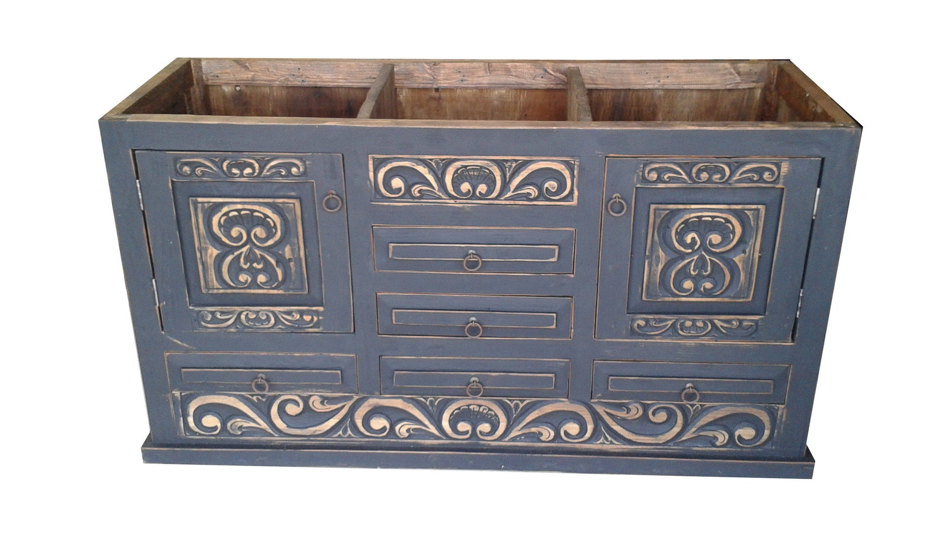 A beautiful black wood vanity hand crafted from 100% barn wood from Mexico. The old barn wood has a lot of unique characteristics, a hand carved, beautiful Mexican design makes it very unique. The wood is hand rubbed with paste wax which protects it from the elements. It comes without a top to make installation easier. 60x22x32